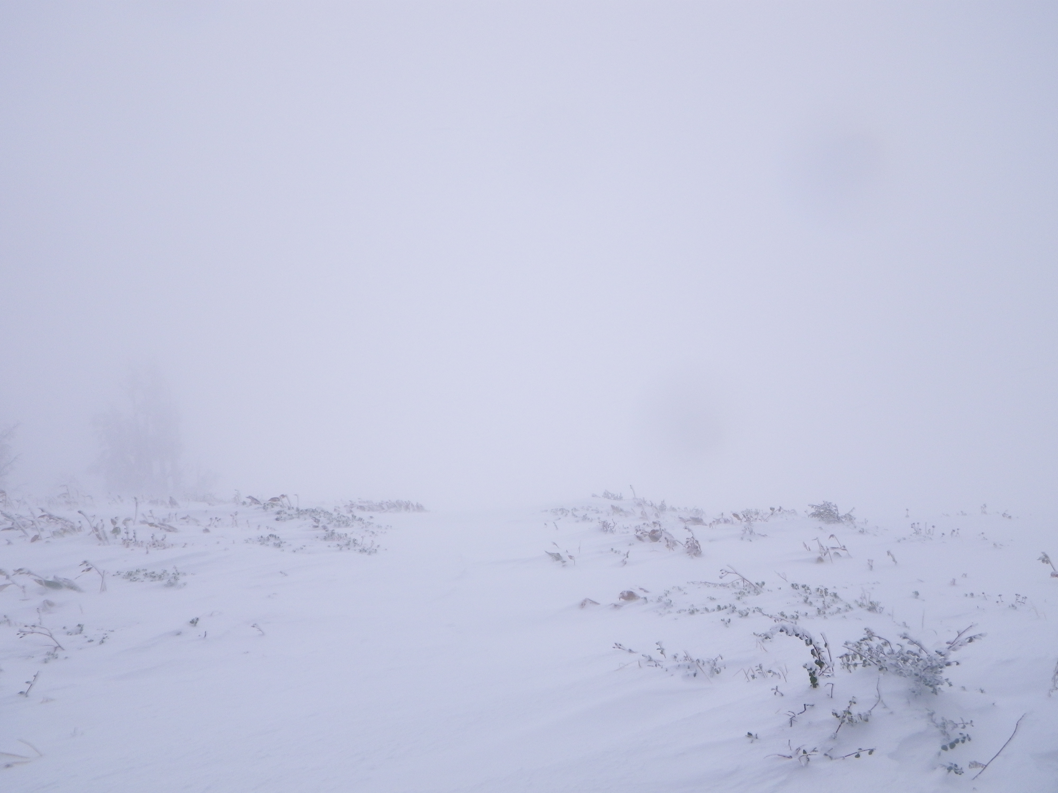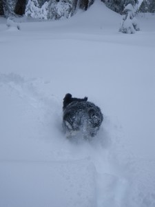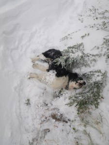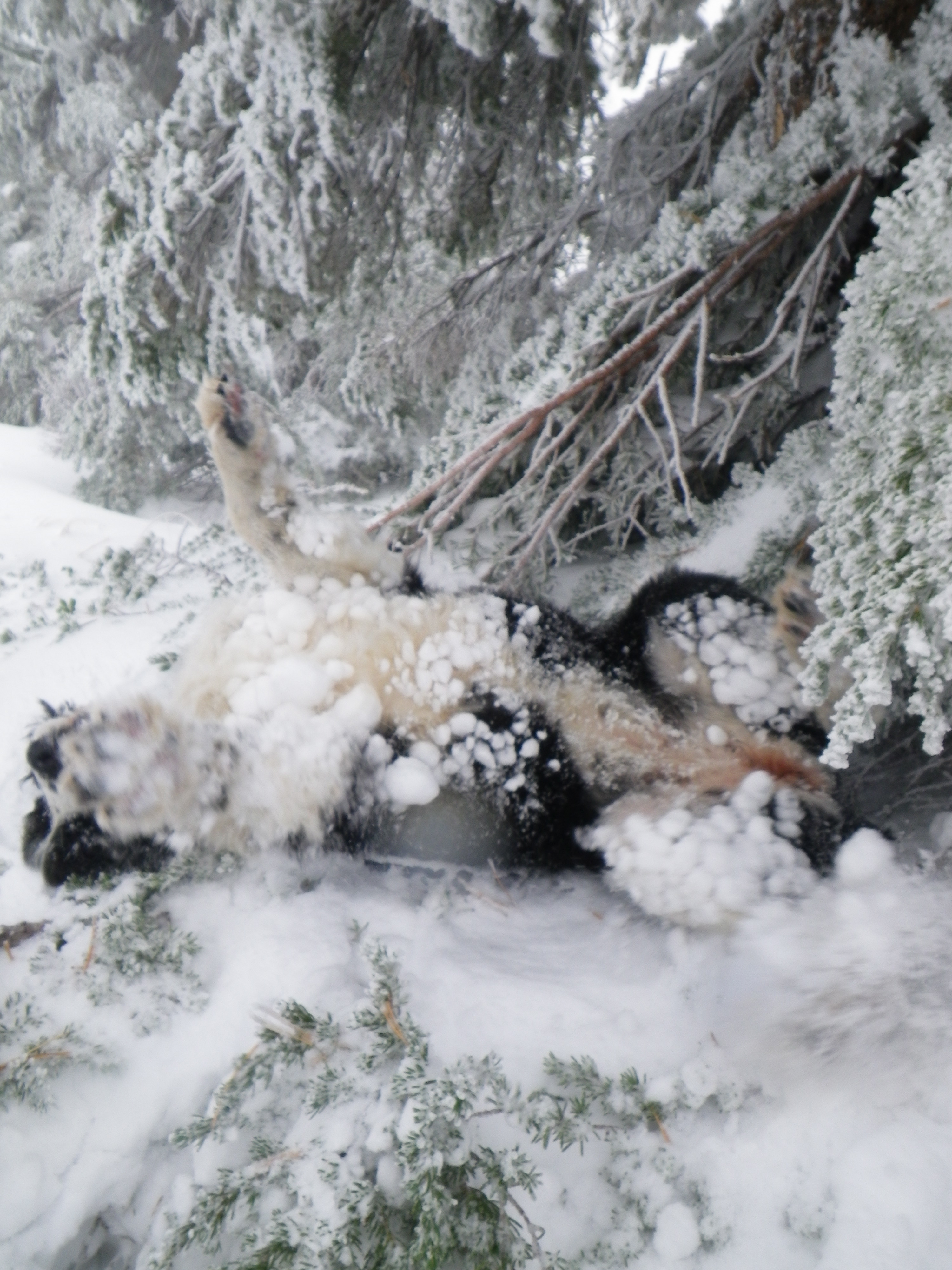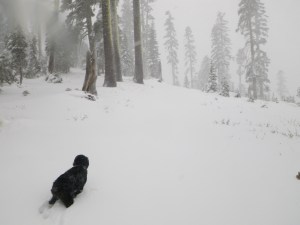 I pick a sheltered spot with a bit of ground still showing and hunker down with Daisy while waiting for a break in the clouds and driving snow. Daisy, struggling in the deep snow a few minutes before, decides it’s play time. Much rolling, growling, and chomping on snow ensues.