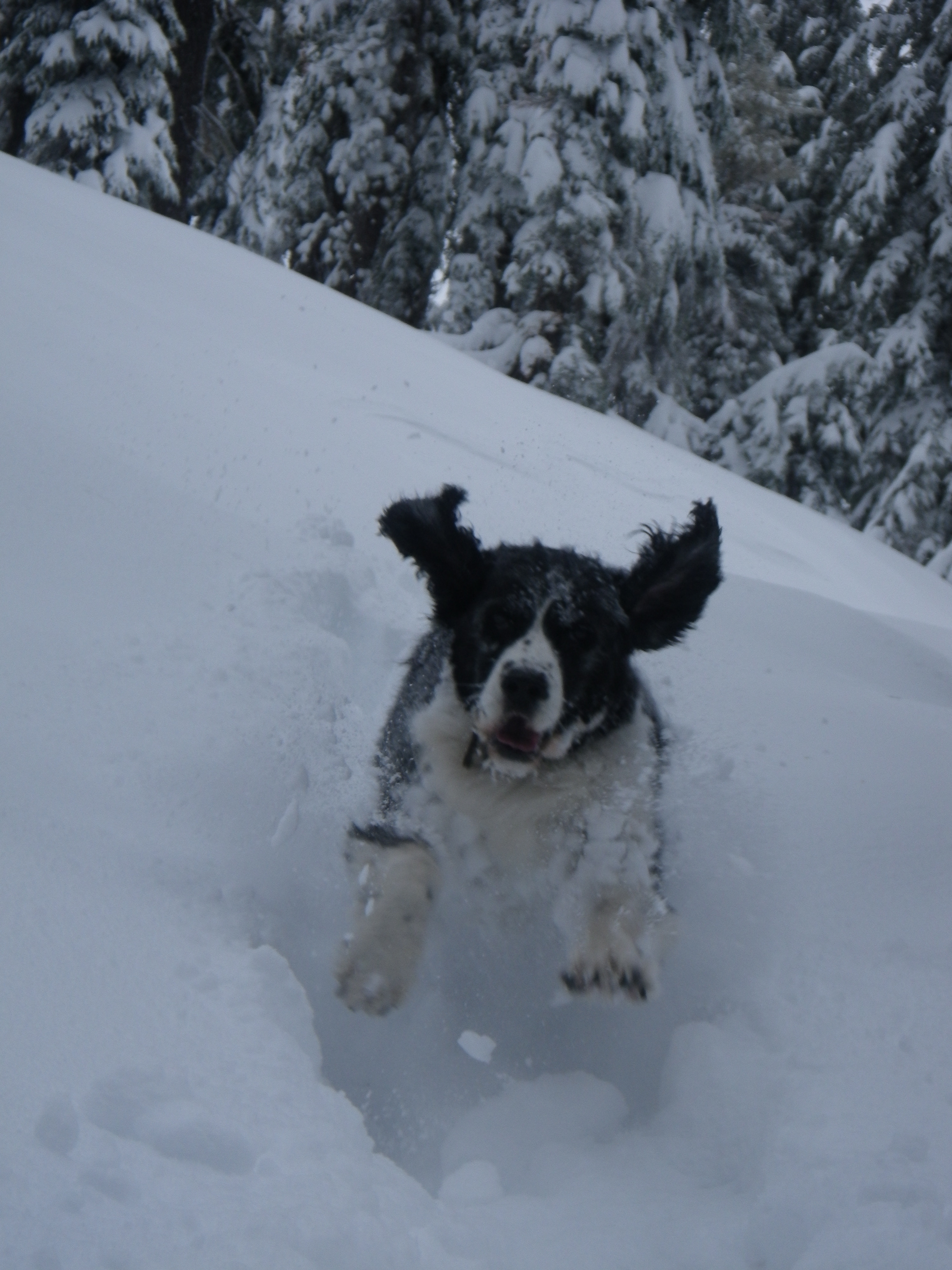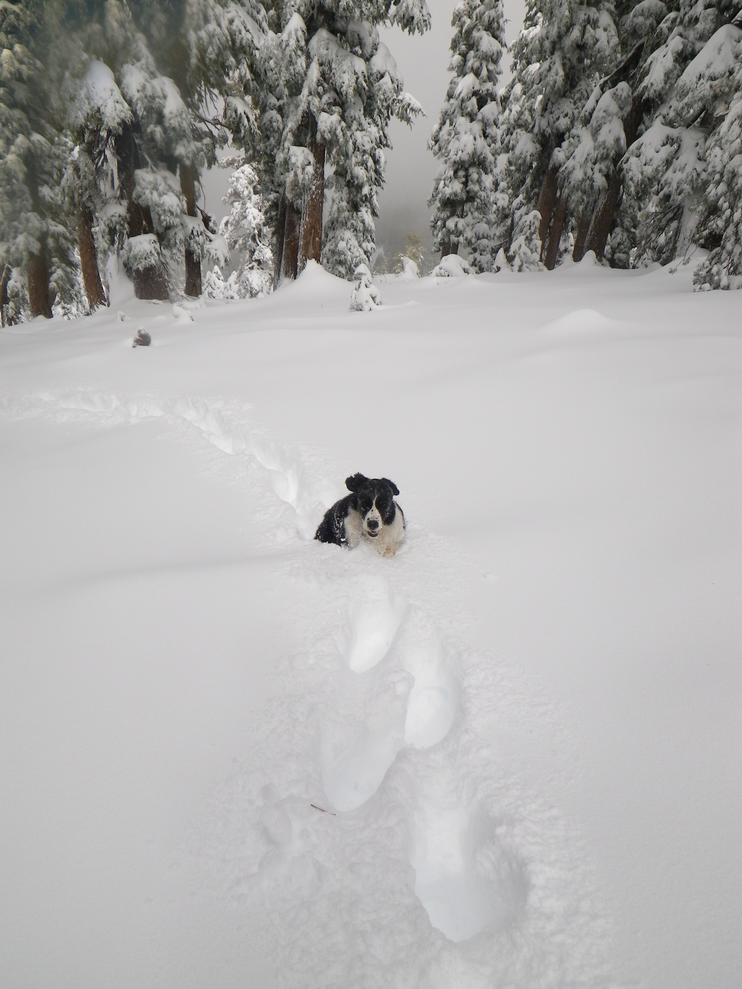 I’m happy to be here to experience it, and the dramatic weather that Tahoe serves up. Still, I’d like a few more weeks of mountain biking, paddling, and trail time. Daisy the Snow Dog and I make our way up Barker Pass. Through slush at the lake and up Barker Pass where the snow gets deeper. It’s deep enough that I’m pushing snow in the car and questioning whether this is smart. Fortunately, I’m following a large 4×4 truck that is leaving big tracks. I did bring the chains and snow shovel, but really don’t want to have to use them.