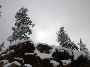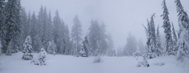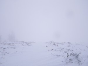 Once at the ridge, all I hear is the sound of the wind through the trees and the hundreds of little impacts of the wind driven snow bouncing off my ski jacket. Clearly, we’re not going to make it to Ellis Peak today without snowshoes. There is little visibility, and slow going through the snow.