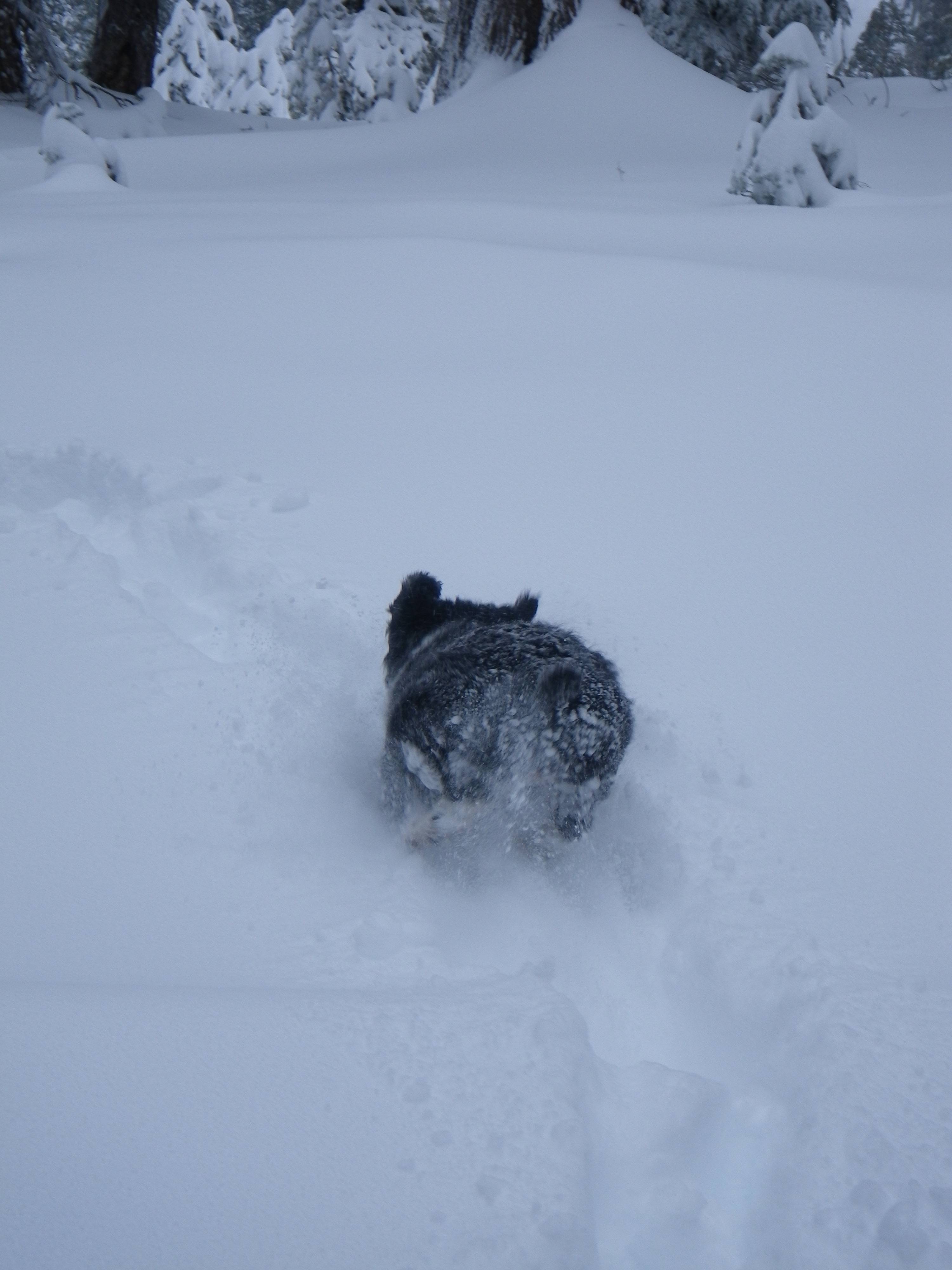 The snow is deep. I have boots and gaiters, but it’s knee deep in spots. I should have brought snowshoes to make it easier for Daisy, who is shoulder deep. Daisy, forever loyal, follows in my tracks.