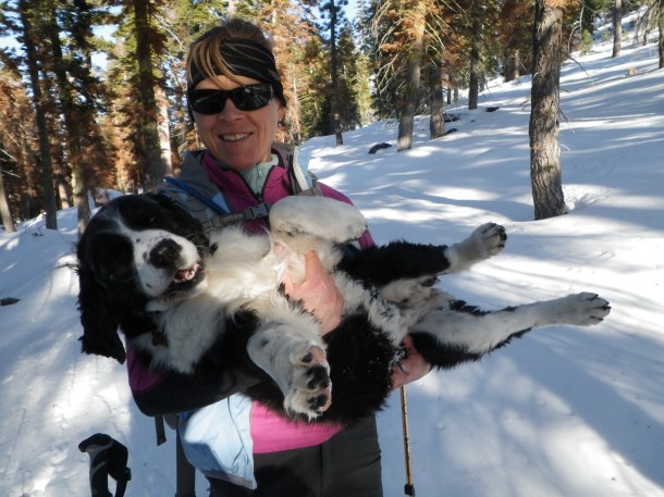 Daisy Snow Dog, enjoying some attention while backcountry skiing in Tahoe. Doing her best to look extra cute.