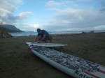 I started with a 10’0″ Bonga Perkins that was just beat. It was covered with ding repairs and heavy. I didn’t know at the time that it was waterlogged in the nose. I found myself pearling the board just standing on it, and missed numerous easy waves because I couldn’t keep the nose from diving. I had a frustrating first day surfing (I nicknamed the board “the shitsucker” after an hour), and swapped it immediately for a 10’0″ x 29″ NSP (a workable, but not high performance board).
