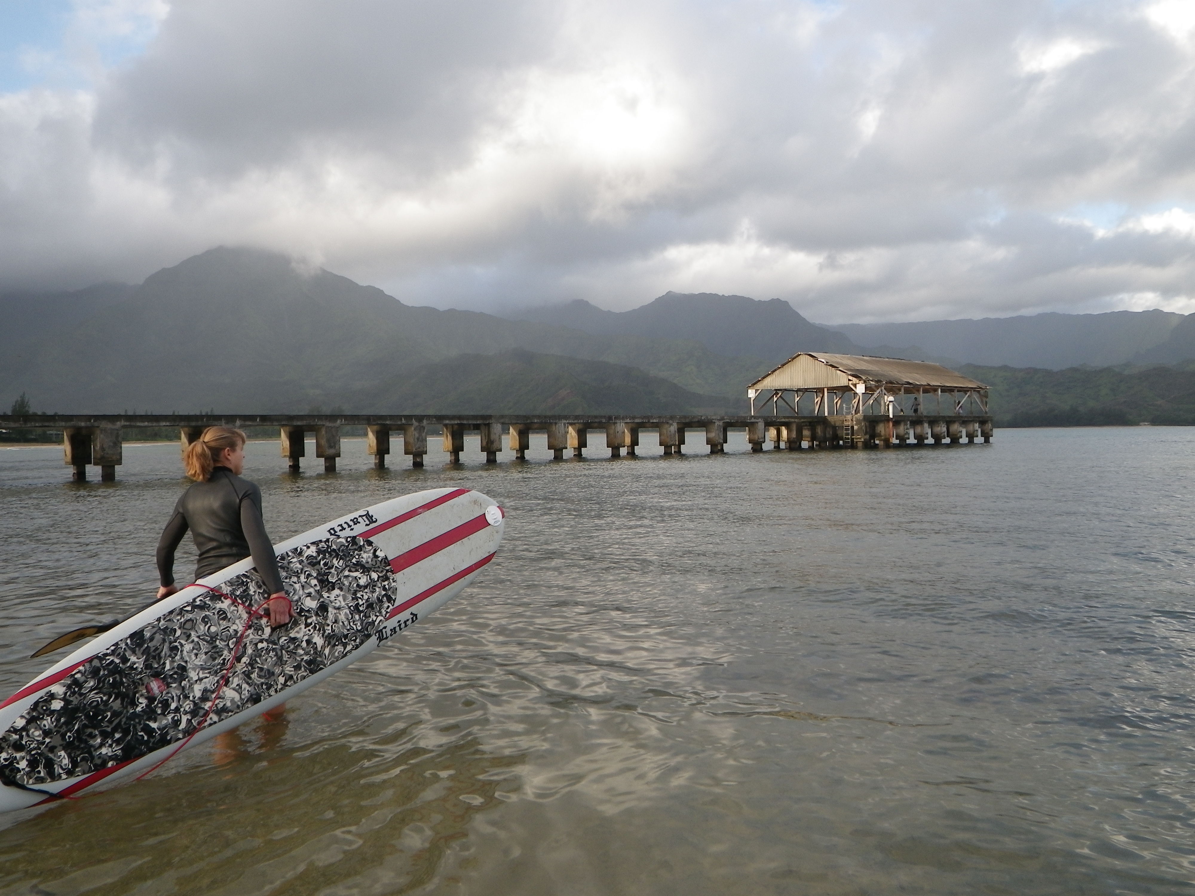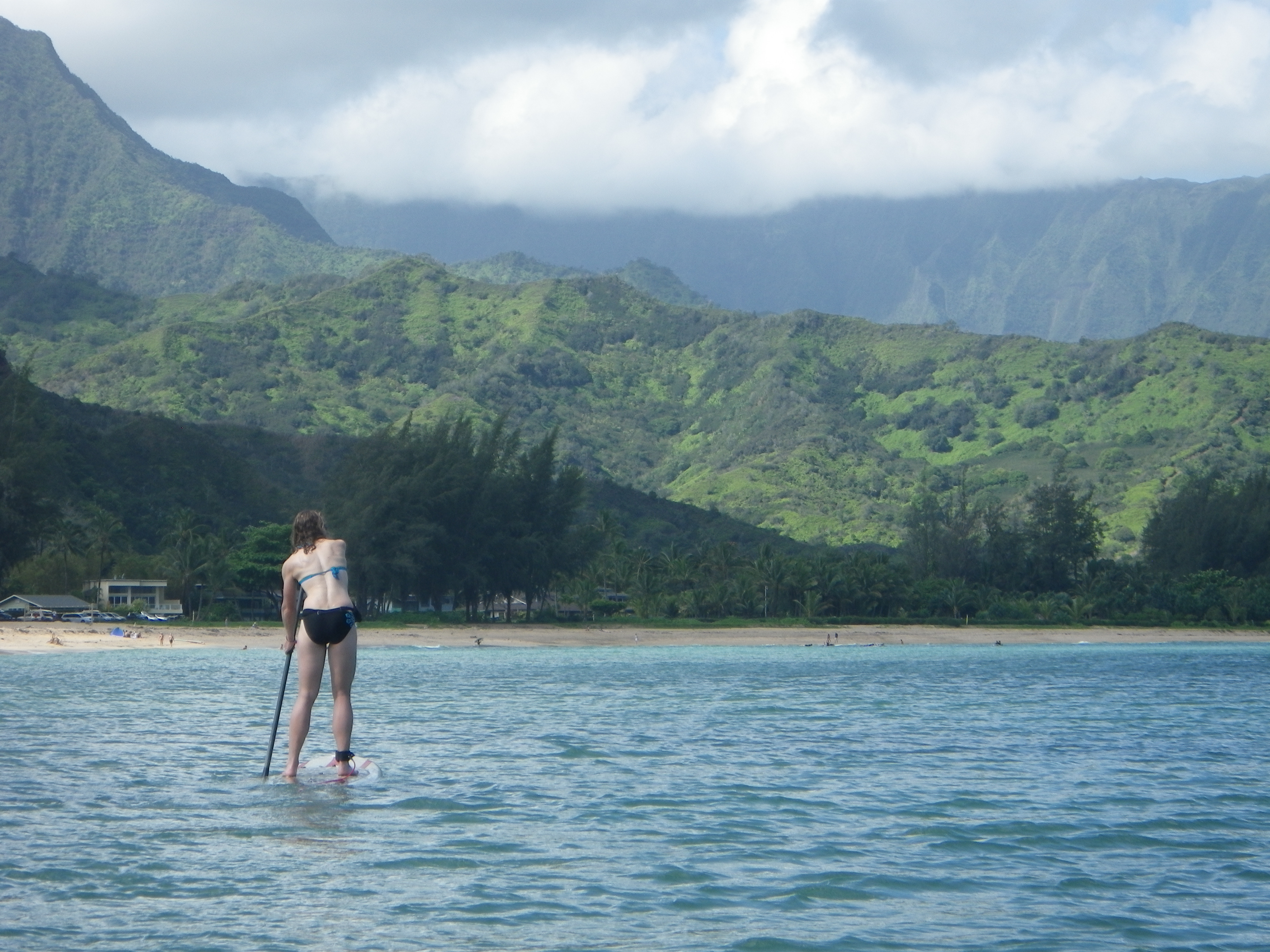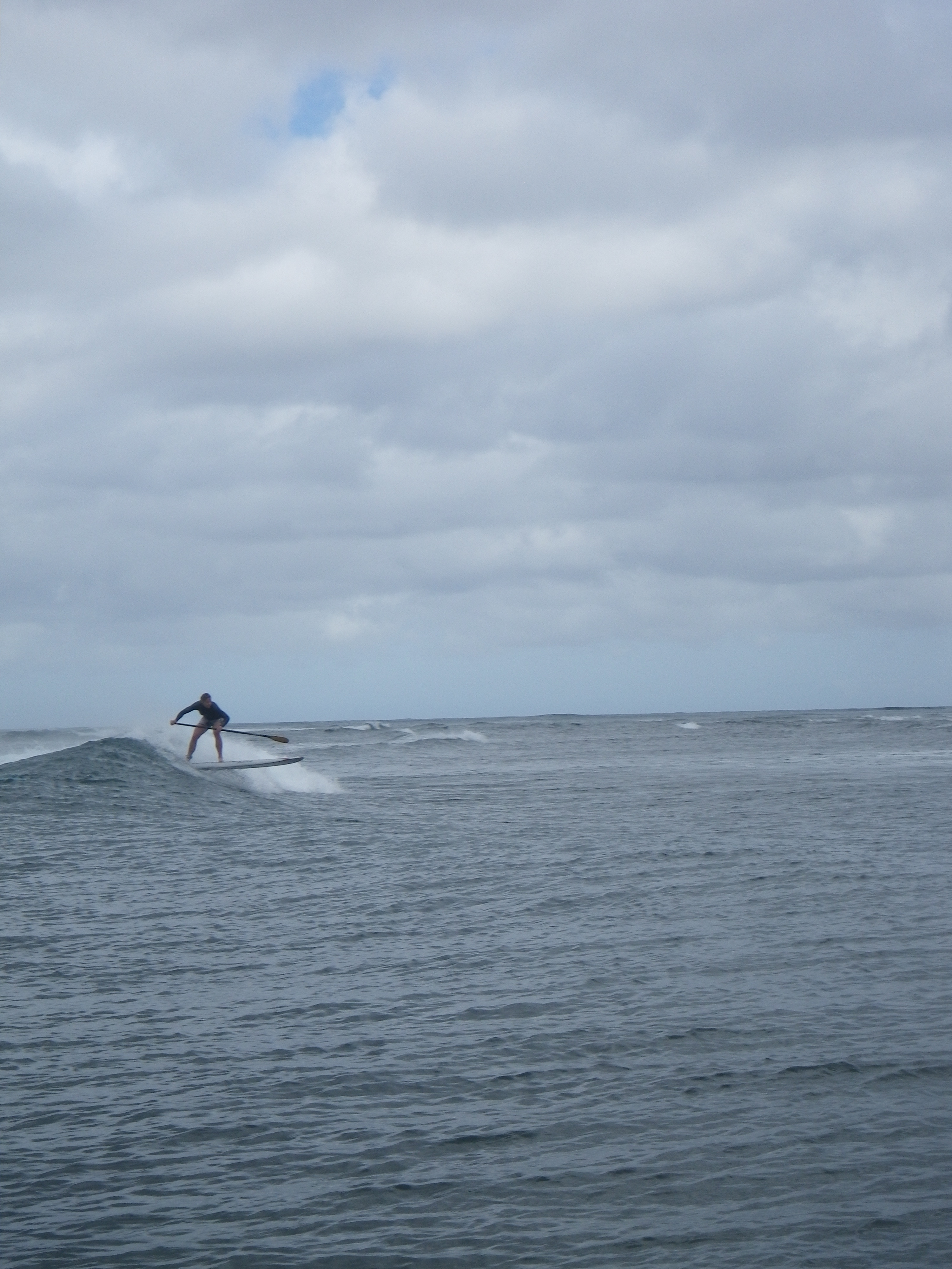 on Hanalei Bay (offshore of the pier and the St. Regis Princeville). There is a great local crowd here, and most of the SUPers know each other. Like all surf breaks, if you are the new people in an established break, you are under scrutiny. We paddled out the first day to check it out and watch a few sets. A wave popped up in front of Helene and she turned and dropped perfectly into an overhead wave, drawing a hoot from the locals and establishing her place in the lineup.