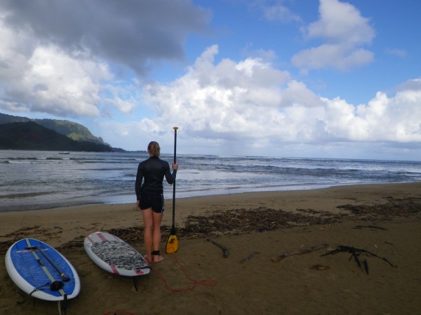 We spent a couple of hours surfing in Kalapaki Bay (Nawiliwili). I’d heard that it was a good SUP break. When we got there, there were strong onshore winds and mushy waves. The water was full of trash and floating debris, including dozens of sticks. Surfing in a shipping port awash with debris isn’t exactly the Hawaii experience I was looking for (sorry no pics). It was fun for an hour or two, but I’m really glad we didn’t stay in Kalapaki. Conditions could be totally different on another day.