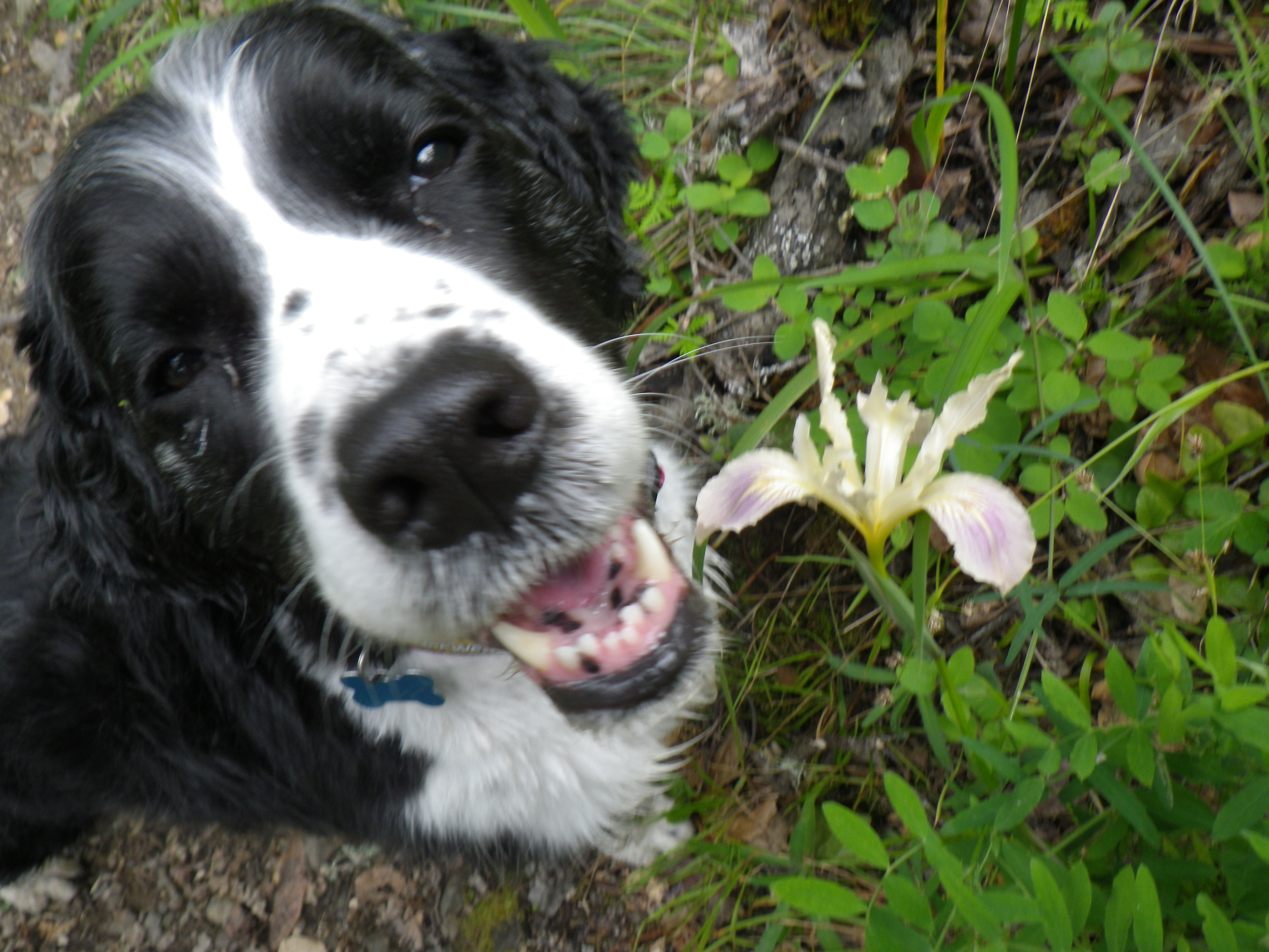 Daisy Trail Dog features prominently in the Tahoe Sux blog. She shows her emotions like any human. Here she is, posing with a wild Douglas Iris- just happy to be in the moment.