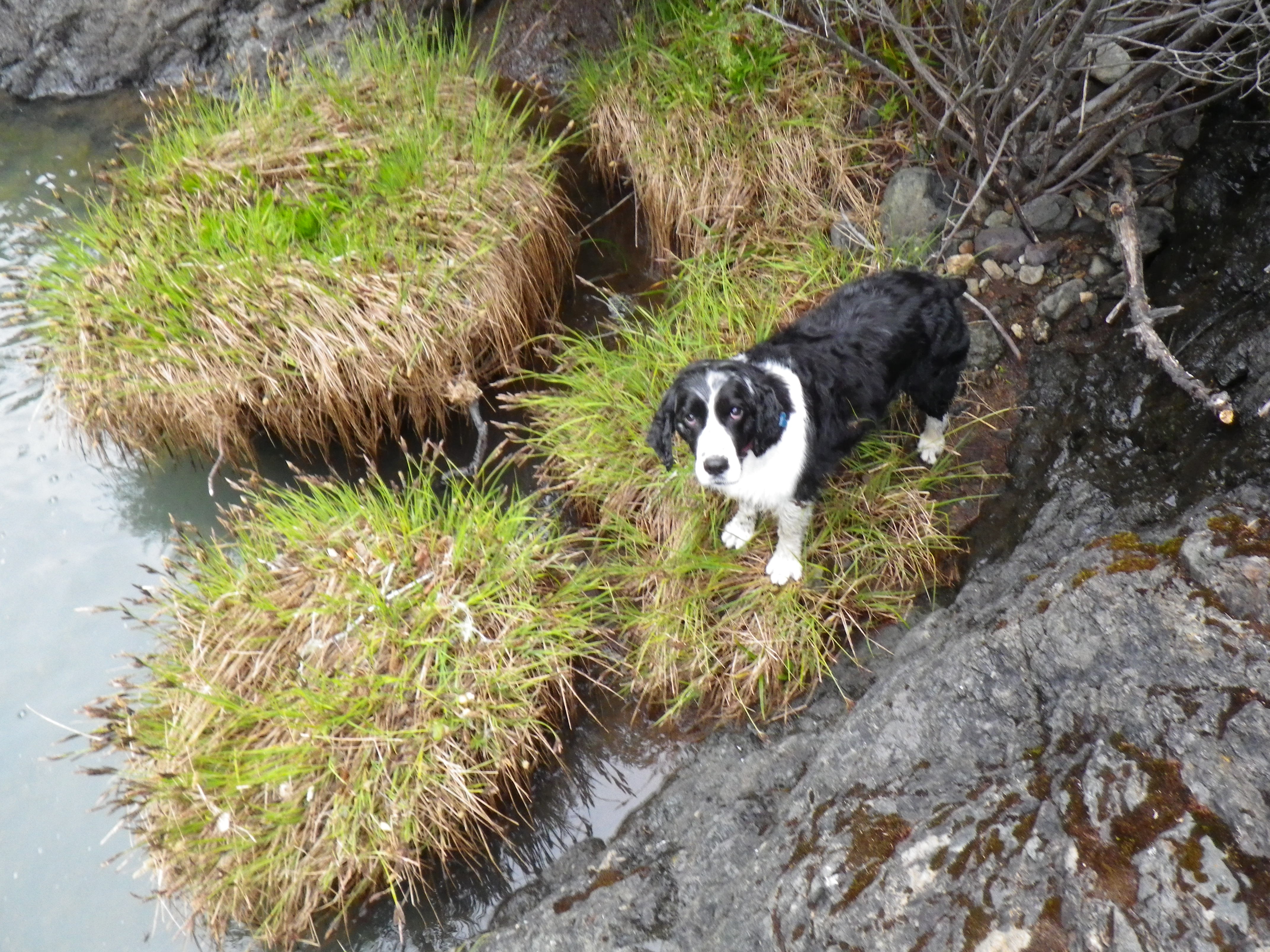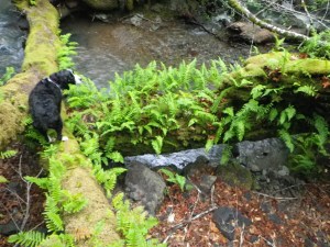 While I was helping Daisy Trail Dog across the slippery rocks to the upper pool, my digital camera fell out of my pocket and clattered down the lower falls to the lower pool! I hadn’t planned on an unexpected skinny dip. (I couldn’t see the camera anywhere in the water). A light rain began to fall to boot, and I had to laugh as I stripped off my clothes. H, from the safety of shore, said “watching you is making me cold.” Fortunately the water was only waist deep at it’s deepest. Still, I was pretty much submerged since I was feeling under all the nooks and crannies of the bottom.