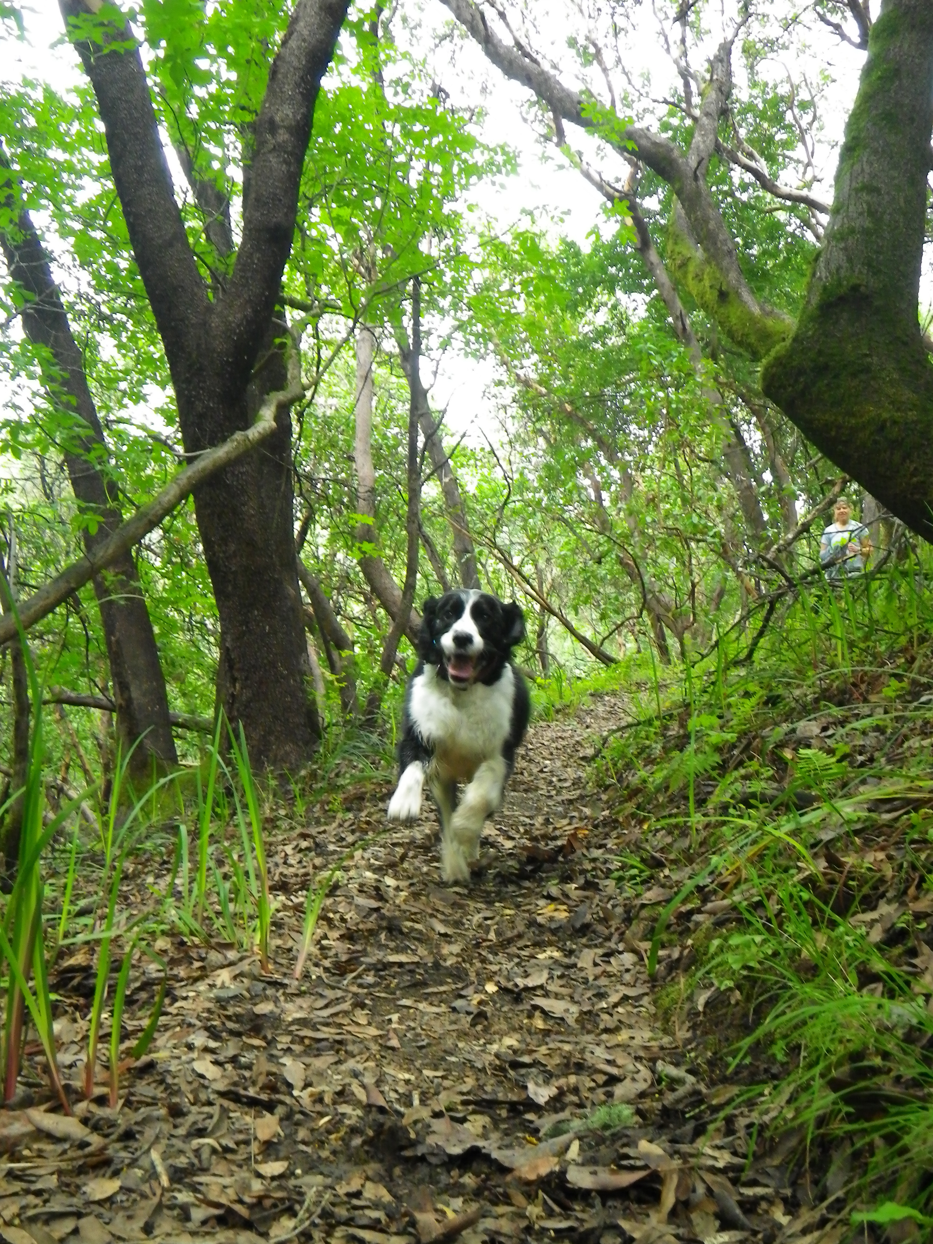 Did I mention spring wildflowers? How about springer spaniels? How about springers spaniels who are positively stoked to be out hiking and playing among the flowers. Who says dogs don’t smile?
