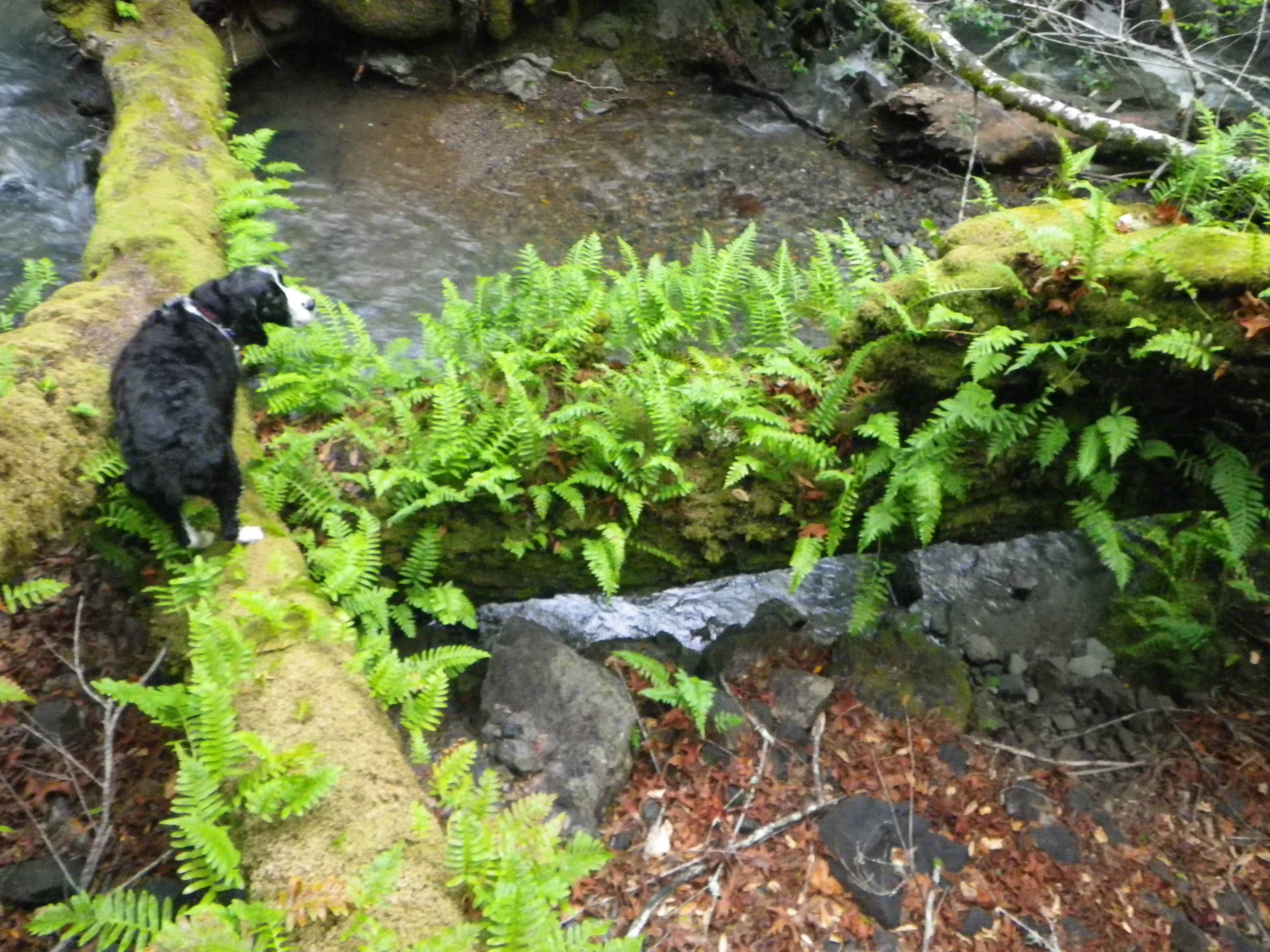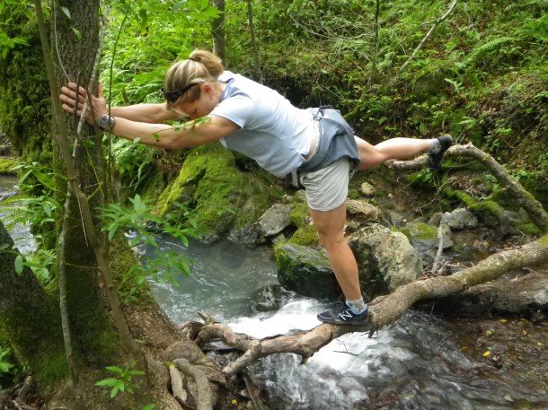 We crossed the creek one last time, crossing on a small log across a narrow spot in the creek. H shows her log ballet skills.