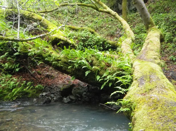 It’s a narrow slot canyon, and the trail sometimes veers away from the creek. When I say “trail,” I mean that it’s little more than an animal path, lined with poison oak. There are many unseen waterfalls you can vividly hear in the distance. Getting to them, though, requires crashing through brambles and poison oak on a steep slope.