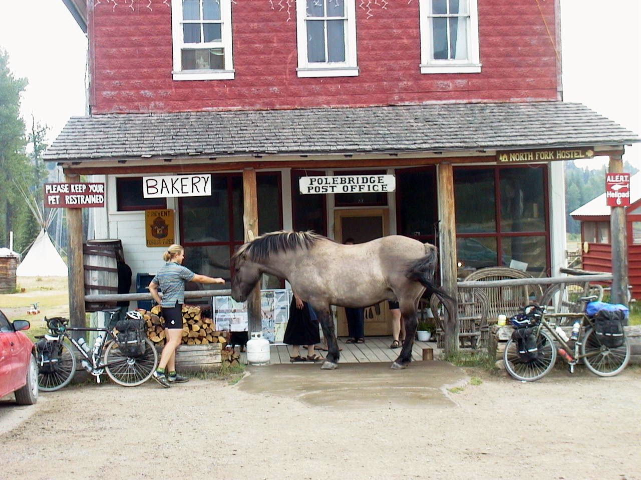 This pic was taken in Polebridge, Montana (just outside Glacier National Park).  I love the sign that says, “Please keep your pet restrained.”  This big draft horse was running amok, and would head straight into the post office every time the door was opened.  The floorboards were bending under his weight.  Very friendly though; he wanted to be where the people were.