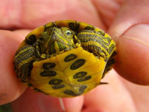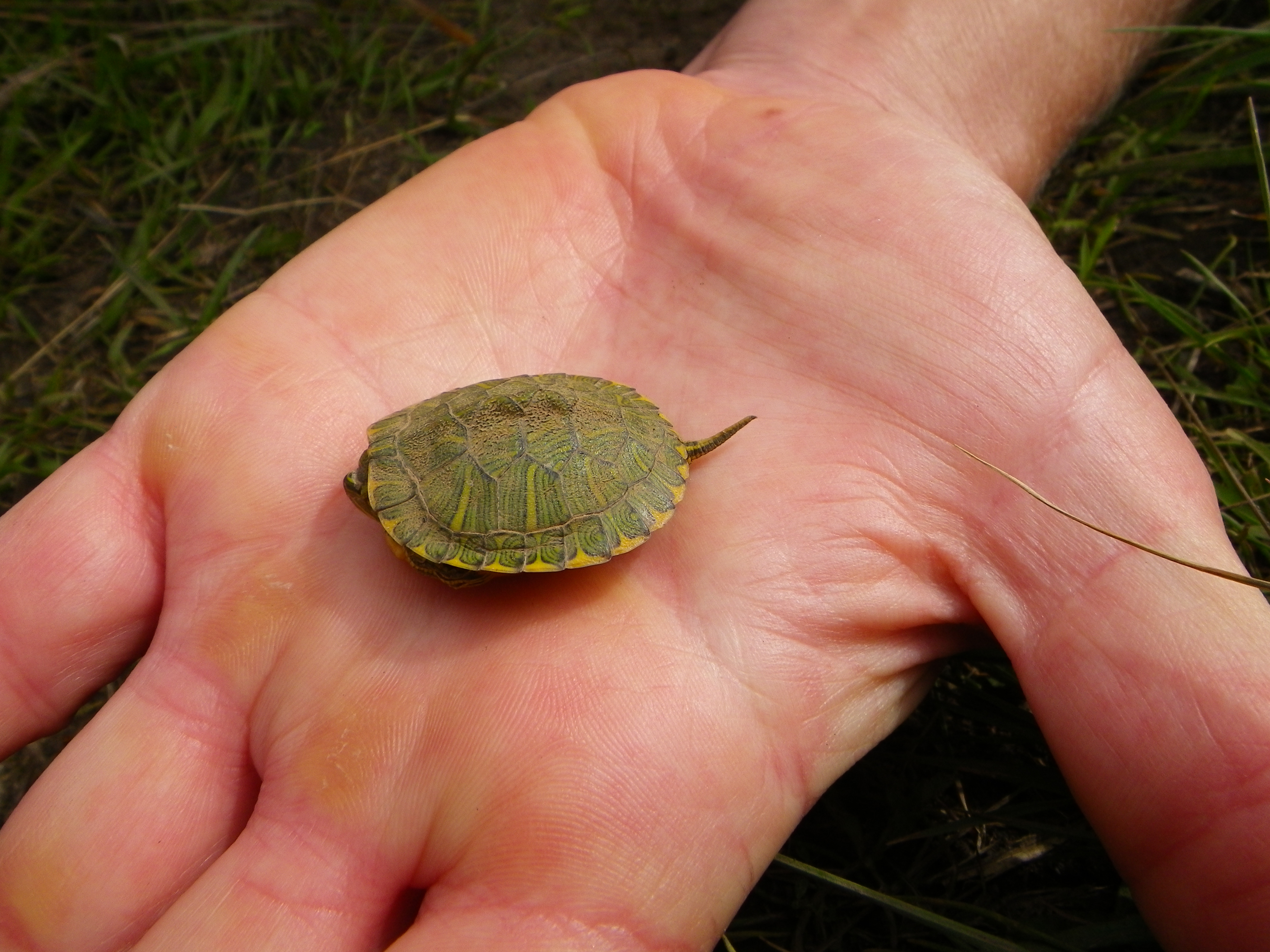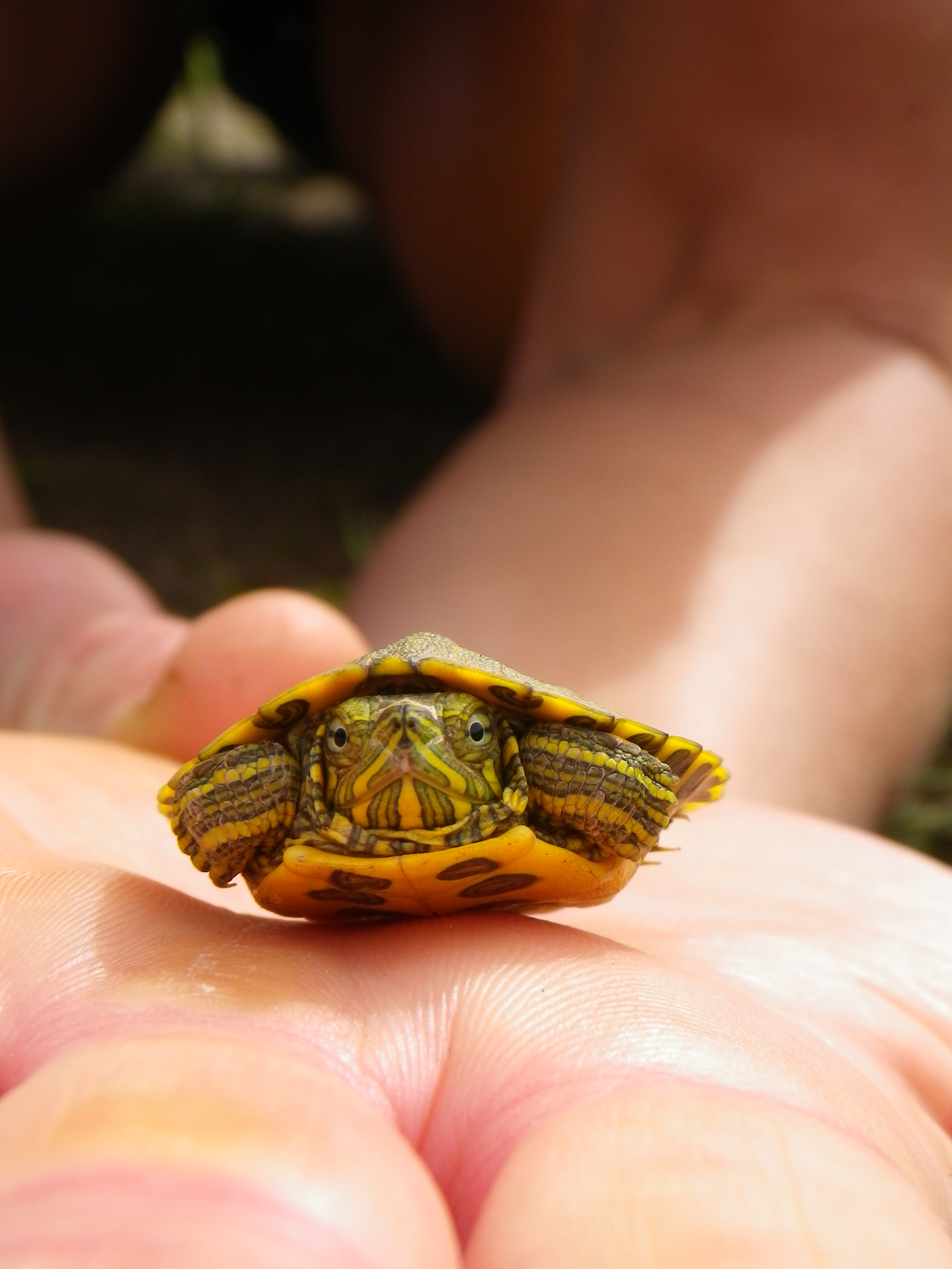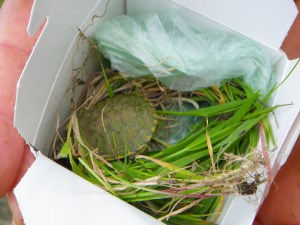 We carefully brought the turtle home. A couple days later, it has a name: Sprout! We got a small starter tank, heater, pump/filter, rocks, etc. Sprout isn’t living in the wild anymore, but has a pimp turtle condo. We’ll look for a much larger tank as Sprout grows.