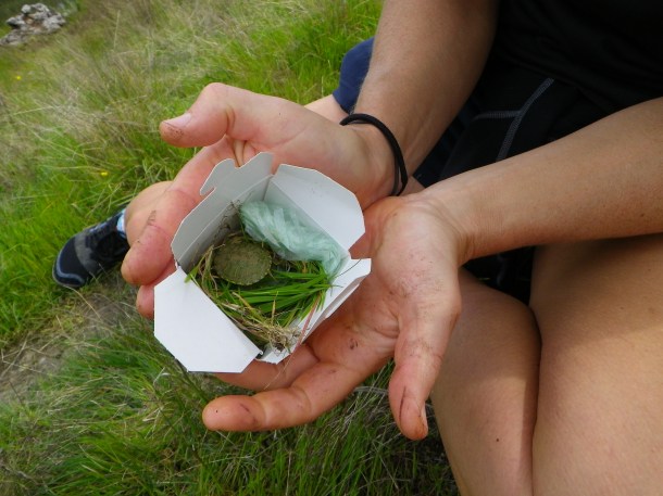 Because we took Daisy Easter egg hunting, I just happened to have a little take out box that we had used for Daisy’s treats (tofu, cheese, and some other treats for easter spaniels). We padded the take out box with a baggie and some grass, and Voila! Take out turtle!