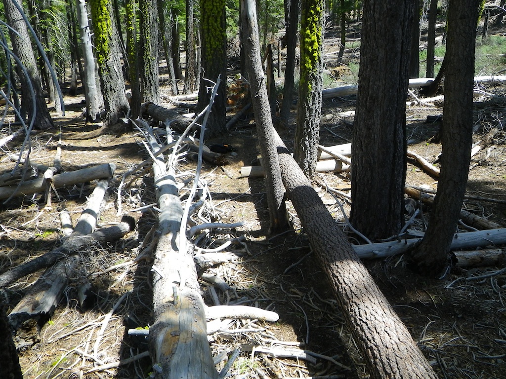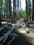 The section of trail in the sequence below was nearly impassable due to multiple trees that had fallen together.  Two 70’+ trees fell diagonally across the trail and were both suspended off the ground.  No easy way to get around this.