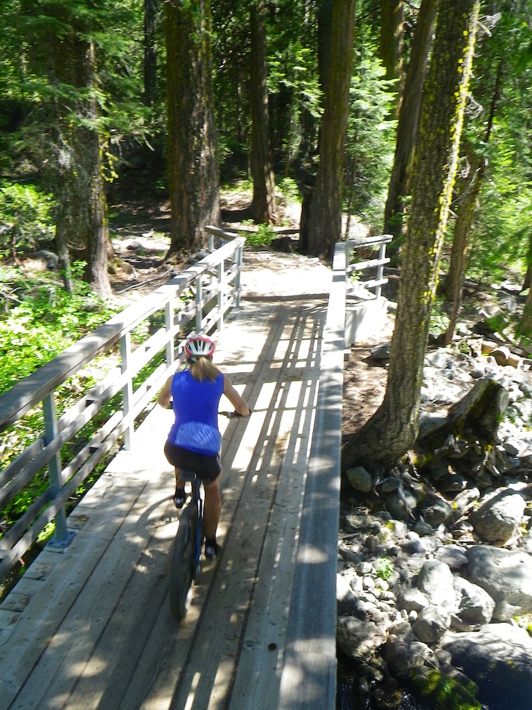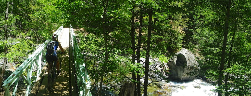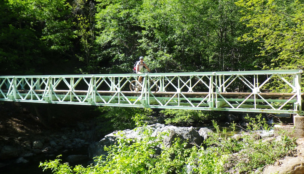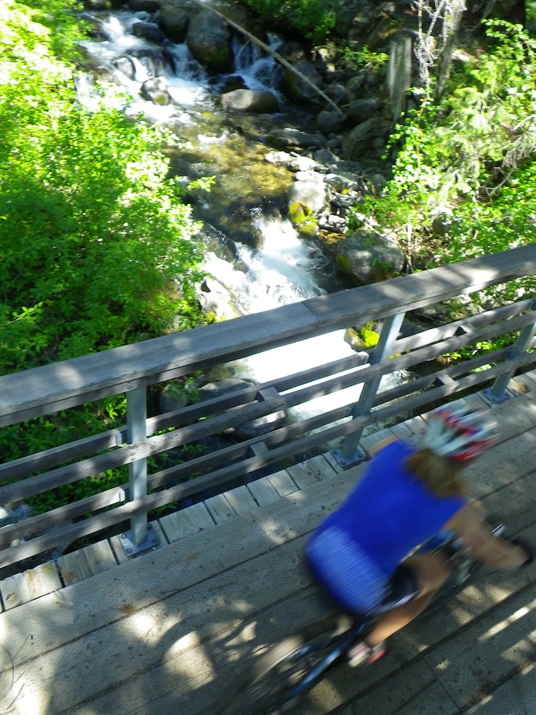 Most people do the ride as a downhill shuttle. We did the ride as an out-and-back and were blown away by the beautiful bridges and scenery. Miles of cascading waterfalls roar along the trail. We found ourselves stopping over and over to check out the falls and views. As a downhill only, the falls and views merge into a blur of speed. Doing the ride as an out and back allowed us to revel in the beauty at the slower speeds of climbing on the mountain bike. Ten miles of mostly climbing, followed by a 10-mile descent. Awesome!