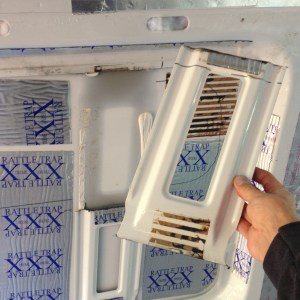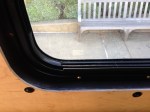I made a small mistake on the installation of my first window. Learn from my mistake. I was in a hurry to get the window finished before dark. It was a cold day and the butyl caulk was fairly stiff and hard to work with. I ended up with a small “lump” of butyl caulk on a back corner. I also forgot to mist the sheet metal with a household sprayer. Misting the sheet metal keeps the butyl caulk from immediately sticking to the sheet metal and helps it to squish and ooze into place. In my case I ended up with a small 1/16″ line of butyl caulk visible on the back corner. Annoying to me but no one else would likely notice. For the second window, I put the butyl caulk in the sun on something dark to get it soft and easier to work with. I also remembered to mist the sheet metal, and the window screwed in perfectly.