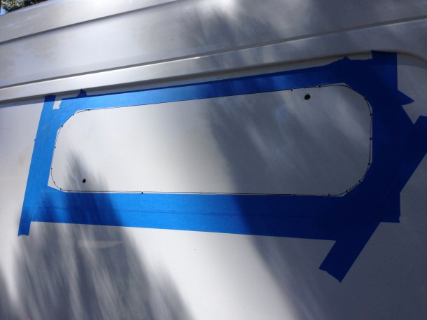 Once the interior was prepped and marked, I drilled small holes along the edge of the cut line to transfer the cut line to the outside of the van. As in the installation of the front CR Laurence windows, I chose to make my cut from the outside since the foot of my jigsaw could sit flat and make for an easier and more precise cut.