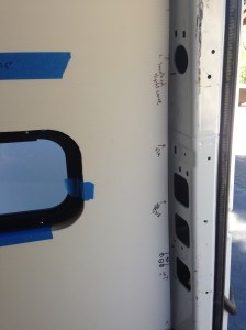 When doing your layout, remember to leave space for the exterior window flange! The hole was roughly 9″ x 34″, but the exterior measurement is 11″ x 36.5″ inches. Make your hole too high and you may run into the lip at the top. I located my windows with about 1.5″ clearance to the lip on the top.