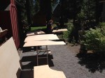 I mounted my platform bed at about 42″ to accommodate my tallest bike (fork mounted + 1-2 inches for clearance). We also have a luxurious 6″ memory foam, three-fold mattress. The bed overlaps the window by a couple inches with bedding. Not a big deal for us, but a design consideration.