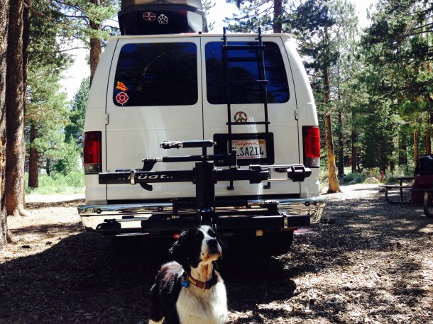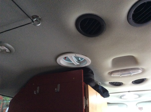 We quickly discovered that roof ventilation was key to sleeping in a van. Condensation and humidity inside a van is a big issue, as we found out on our first road trip (with dripping windows and a muggy humid interior). We also travel everywhere with our dog, Daisy. Keeping her cool comfortable and safe critical when we are out riding or surfing. Because our van started as a passenger van, we had the AC ducting running down the center of the ceiling. I installed two Ventline Vanair vent fans (front and back). Why two fans? Simple, I wanted to be able to move air from the front to the back of the van, and also to be able to stealth camp with all the windows up. I also wanted to be able to blast fresh air through the van when Daisy was sleeping in it while we were out on our bikes.