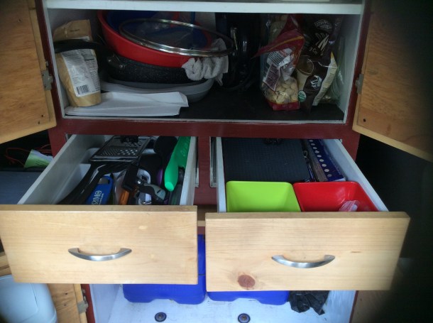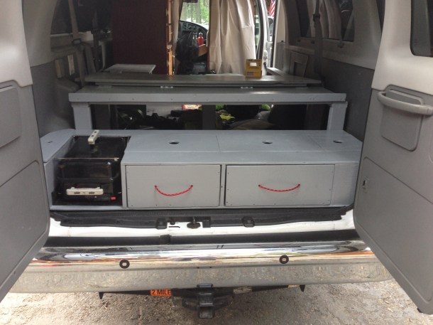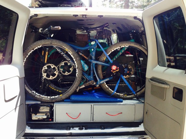 A “garage” for interior bike storage, wetsuit storage, or other “stuff” really improved the quality of life inside the van.