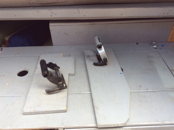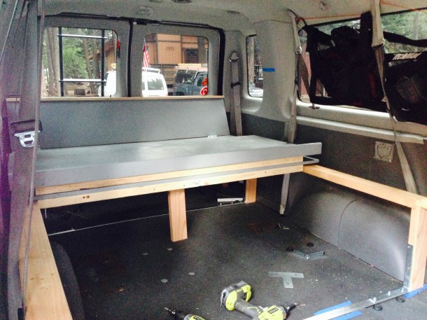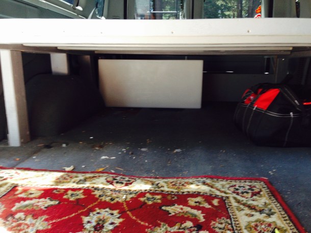For the bed, I made a platform bed approximately 15.5″ off the van floor. It had three sections and could be folded up for more interior living space. It also could slide to the very back of the van if we weren’t carrying bikes (by using folding locking hinges).