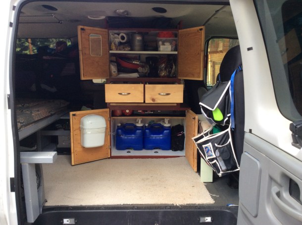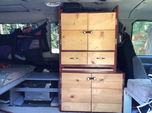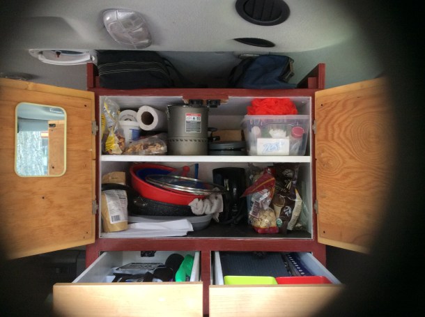 After I removed all the seats, I built a large cabinet from recycled wood behind the driver’s seat. It stored all of our cookware, 8 gallons of water, 2 burner stove, toiletries kits for both of us, and a bunch of food. It was the tallest cabinet I could squeeze into the van and maximized all available space.