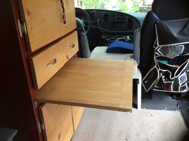 So much of VanLife is about making efficient use of all available space. After looking at the side door for a year, I built a custom cabinet that attached to the door. The door cabinet was sized to be able to fit three gallons of water and had a fold out table.