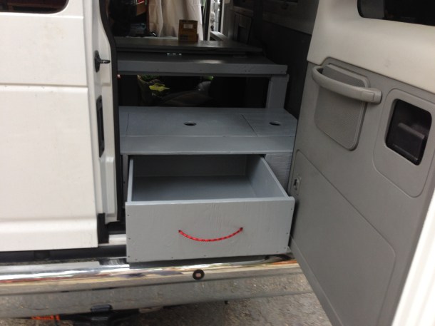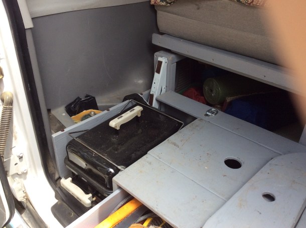 DIY VanLife is all about “borrowing” conversion ideas from others. I saw a cool Sprinter in Oregon with pull out drawers in the back, and applied that idea for rear door storage. I wanted to be able to store our expensive bikes inside when necessary, or to be able to travel in stealth mode (sleeping with bikes inside). I also added a compartment for our portable Weber propane barbeque. We could be barbecuing in five minutes and stow the grill as soon as it cooled down!